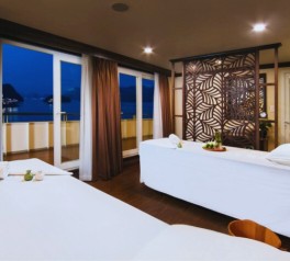 After dinner, enjoy the tranquil night scenery of Lan Ha Bay from the sundeck. Relax with soft music, sip cocktails from the bar, try night squid fishing, watch a movie, or unwind in your private cabin.