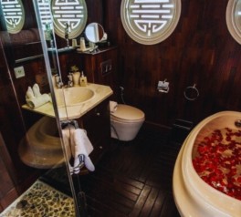 Return to the cruise to freshen up as The Au Co Cruise Ha Long Bay continues sailing toward a calm overnight anchorage, offering serene views of limestone islands and peaceful waters.