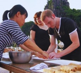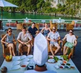 Join a cooking or fruit carving demonstration on the sundeck or in the restaurant (weather permitting). Admire the sunset over Ha Long Bay while enjoying Happy Hour promotions on selected drinks—one of the highlights of a luxury Ha Long Bay overnight cruise.