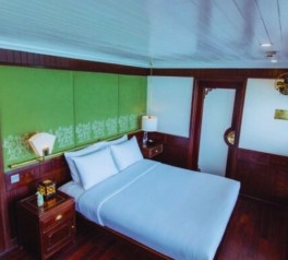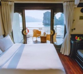 Retire to your cabin for a restful overnight stay onboard, surrounded by calm waters, limestone silhouettes, and the peaceful atmosphere of Ha Long Bay.