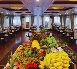 A light breakfast is served in the restaurant as the cruise continues morning cruising through Ha Long Bay, offering serene views and a relaxing final morning onboard.