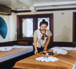 Start your day with a rejuvenating sunrise Tai Chi lesson in Ha Long Bay, surrounded by dramatic limestone karsts and calm emerald waters. Gentle movements and fresh sea air create a peaceful and energizing morning on your Ha Long Bay overnight cruise. Complimentary tea and coffee are served in the restaurant.