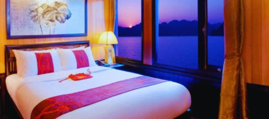 Conclude Day 1 of your Ha Long Bay overnight cruise and relax in your cabin, surrounded by calm waters, limestone silhouettes, and the iconic beauty of Ha Long Bay, Vietnam.