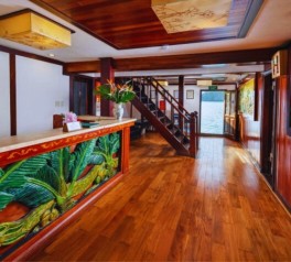 Guests joining Luon Cave kayaking in Ha Long Bay gather at the reception desk on the first floor. Depart directly from the cruise in two-seater, self-rowed kayaks and paddle through the serene Luon Cave area, guided by an experienced kayaking leader.