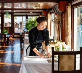 Begin your morning on Ha Long Bay with freshly brewed coffee, tea, and breakfast pastries served in the dining room. Enjoy the peaceful early hours of Ha Long Bay as limestone islands emerge from calm waters.