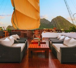 Choose your preferred activity: kayak among limestone karsts in Bai Tu Long Bay Vietnam, relax on the sundeck, or enjoy afternoon tea while watching the sky change colors during sunset.