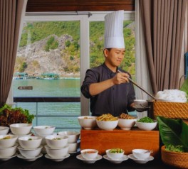 As the cruise anchors for the night, take part in a Vietnamese cooking demonstration or enjoy Happy Hour* with canapés at the Piano Lounge or on the sundeck (weather permitting).