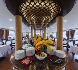 Enjoy a delicious buffet lunch at the onboard restaurant while the cruise begins sailing through the iconic limestone landscapes of Ha Long Bay.