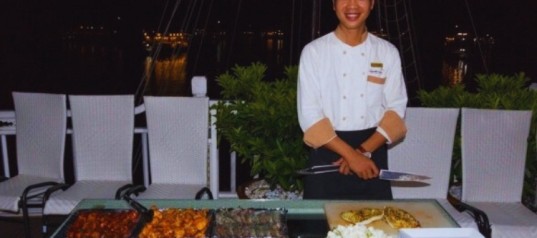Relax during Happy Hour at the bar with a special Buy One Get One Free drink menu while enjoying sunset views over the bay. Join a Vietnamese cooking demonstration and learn to prepare authentic local dishes with guidance from the onboard chef.