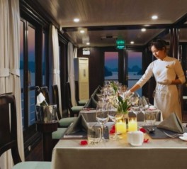 Savor a delicious lunch at the onboard restaurant as Lily Cruise begins its journey through the serene waters of Bai Tu Long Bay, recognized as one of the world’s most beautiful bays by the World’s Most Beautiful Bays Club.
