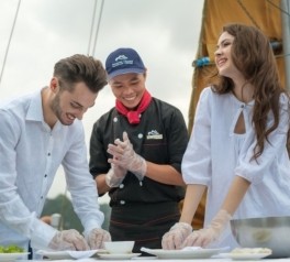 Activities: Morning Tai Chi session, buffet breakfast, sightseeing aboard Paradise Explorer, explore Tien Ong Cave, kayaking or bamboo boat at Cua Van Fishing Village, afternoon tea, sunset cooking class, dinner, and evening entertainment.