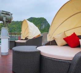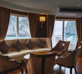 Relax with afternoon tea aboard Paradise Explorer while soaking in panoramic views of Halong Bay.