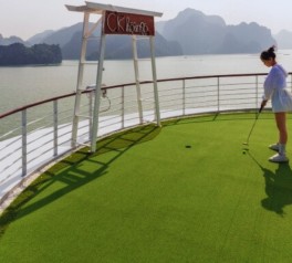 Activities: Hotel pickup → transfer to Tuan Chau Marina → check in to Capella Cruise → savor lunch onboard → outdoor fun at Frog Lagoon (pool, jacuzzi, waterslide, kayak, SUP, mini-golf) → sunset snacks & Happy Hours → Vietnamese cooking class → gourmet dinner → evening recreations (Cigar & Poker room, board games, squid fishing) → relax & overnight onboard.