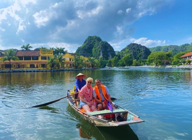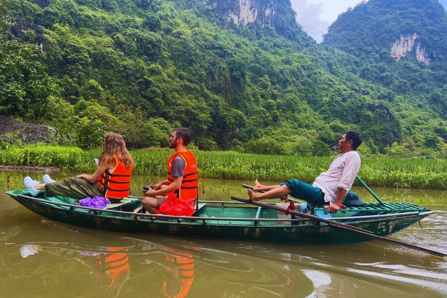 Upon arrival, enjoy a relaxing Tam Coc boat trip, one of the most popular experiences in Ninh Binh: